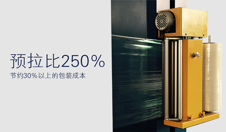 1、膜架為動(dòng)力預(yù)拉伸機(jī)構(gòu),預(yù)拉伸可達(dá)250%,減少耗膜量。